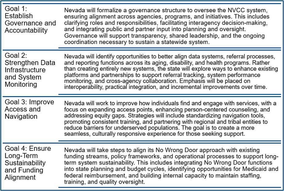 Nevada's lead No Wrong Door entity, the Aging and Disability Services Division (ADSD), used their No Wrong Door system grant to develop a Monitoring and Evaluation (M&E) Framework for their Nevada Care Connection (NVCC). The M&E Framework focuses on system-level tracking, designed to inform continuous quality improvement and support long-term sustainability. The governing body established by ADSD under the grant, the Nevada Care Connection Collective (NCCC), is the primary body responsible for reviewing progress and guiding course corrections for the NVCC. NCCC meetings align with key planning and budget timelines to allow state and local decision-makers to set statewide objectives, resolve system-level issues, and guide the strategic direction of the NVCC. Participating entities include: