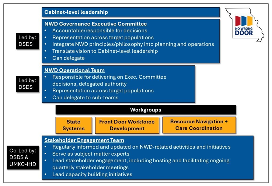 - Expand No Wrong Door Executive Committee and No Wrong Door Operational Team to include more comprehensive representation of systems that serve LTSS populations and key No Wrong Door functions by incorporating at least two of the following three state entities via letters of commitment: the Missouri Department of Social Services; Missouri Division of Behavioral Health; Missouri Department of Elementary and Secondary Education - Vocational Rehabilitation. As of 2026, UMKC-IHD updated the No Wrong Door Governance and Administration structure to include Cabinet-level leadership to drive systems change at the highest level of state government.